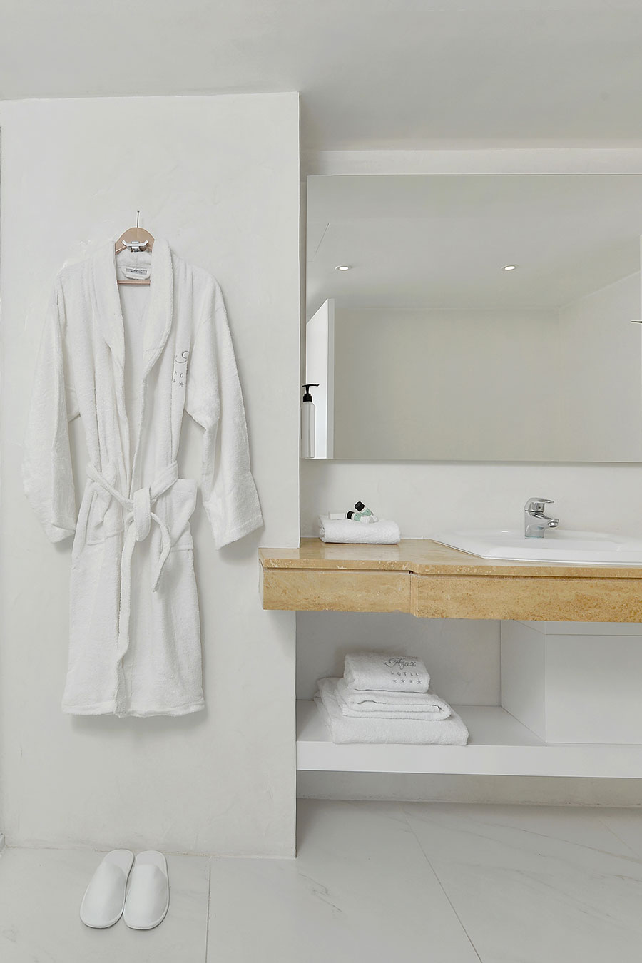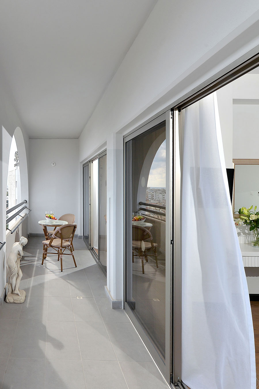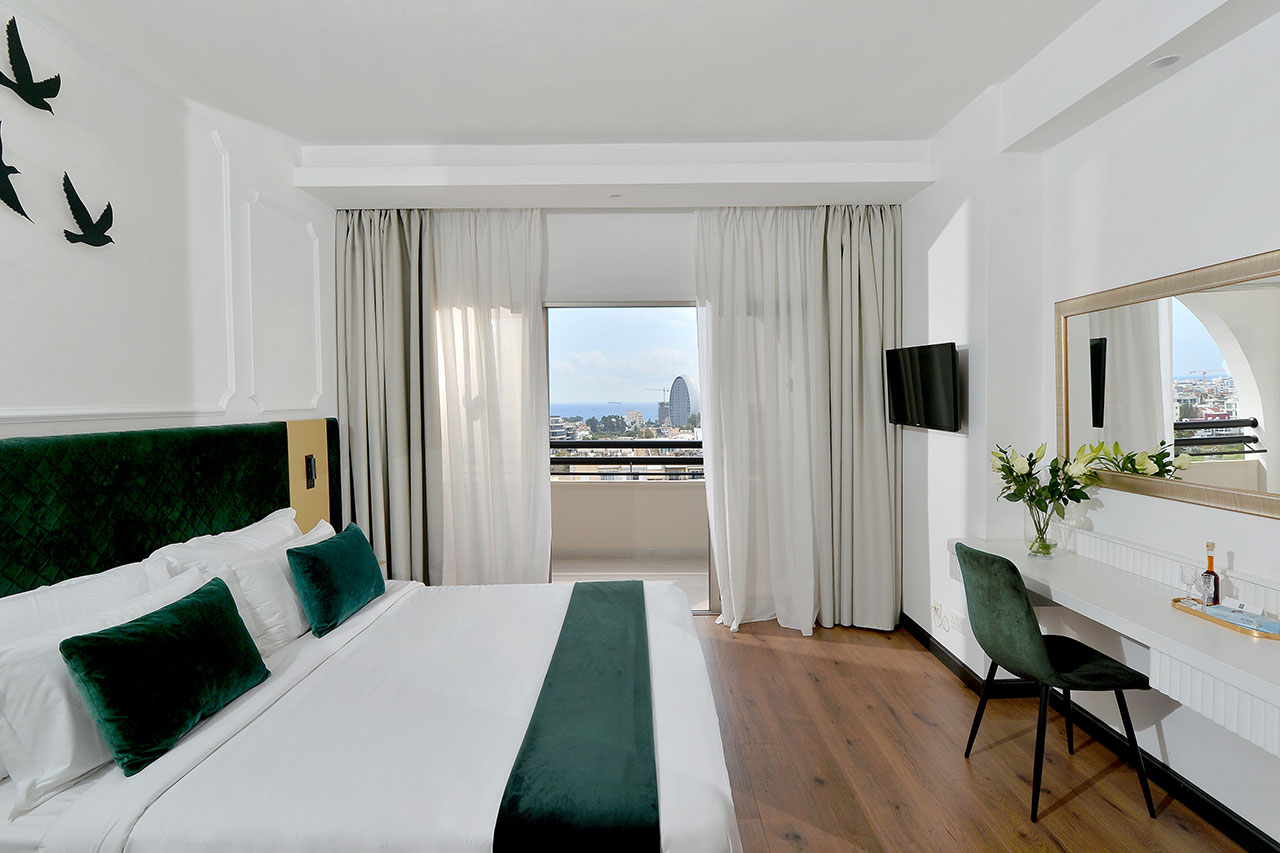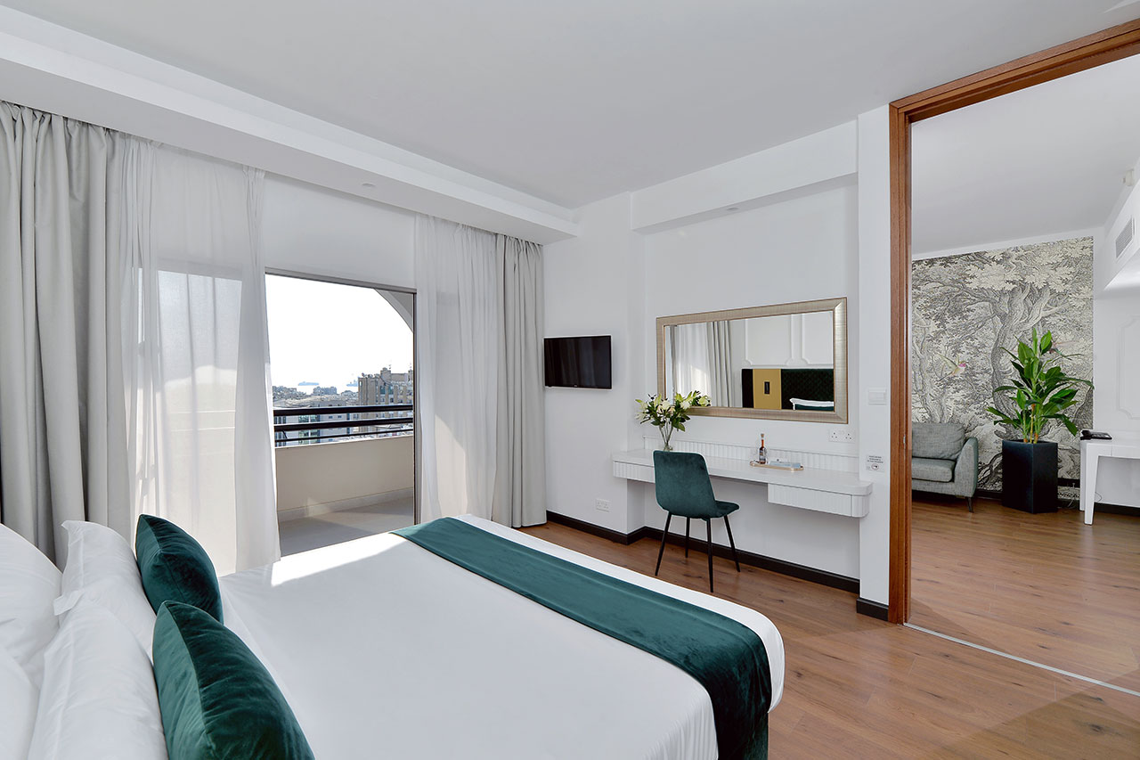 Our Executive Suites are ideal for those who need the extra space and luxury of a suite. Suitable for single, double occupancy, the executive suite rooms have splendid pool views and feature Double accommodation, with ample space for a third bed. Average of 45 square meters in size, the Suites embody the contemporary residential elegance that defines Ajax. Comprised of a beautifully furnished living room, a separate airy bedroom and a marble bathroom, the Suites are ideal for entertaining and extended stays in the cosmopolitan city of Limassol. Executive Suites benefit all necessary in-room facilities, such as king size double bed, self-controlled air condition system, eco-friendly toiletries, double glazed windows, safe box, fully stocked mini bar, direct dial telephone, wake – up alarm system, hairdryer, tea, and coffee making facilities replenished daily. All suites are well appointed with wireless internet access, bathrobes, and slippers for an even more relaxing and comfortable stay